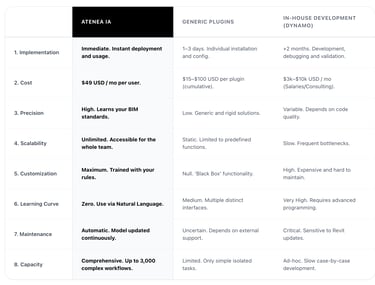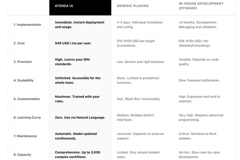 ATENEA can perform all these tasks. We release a new feature every week. We currently control 1% of Revit; then, 100%. And after that, more tools you use every day: AutoCAD, ArchiCAD, SketchUp, Rhino, Grasshopper, and more.