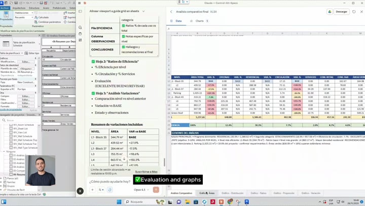 Atenea automatically extracts areas by level and use, compares project efficiency, and visualizes trends to highlight optimization opportunities